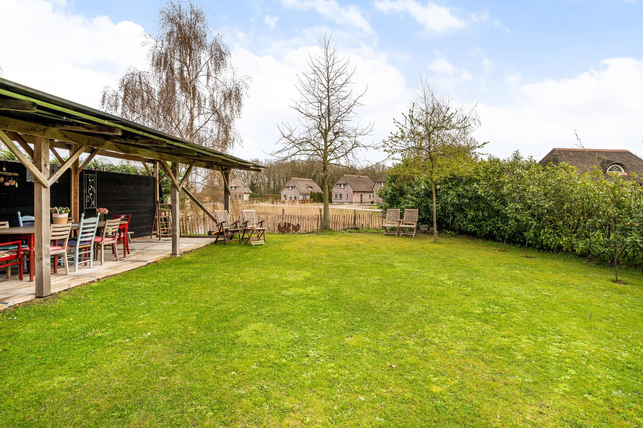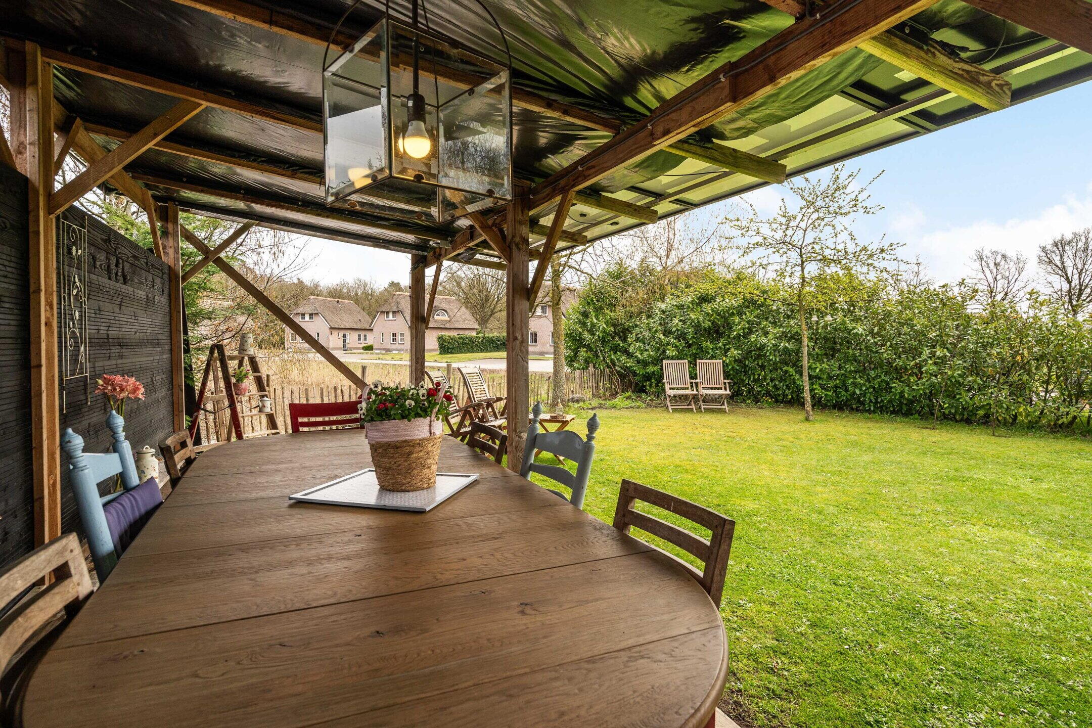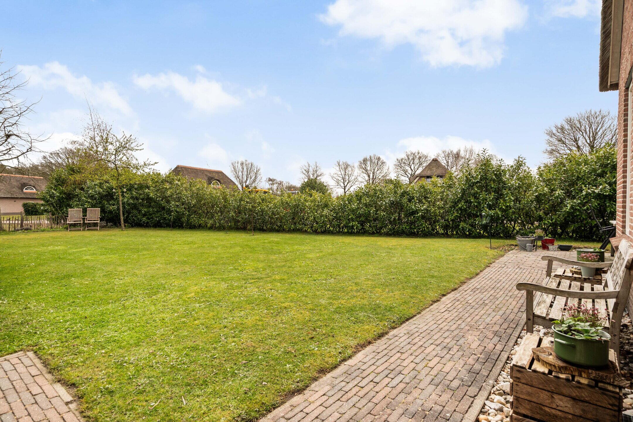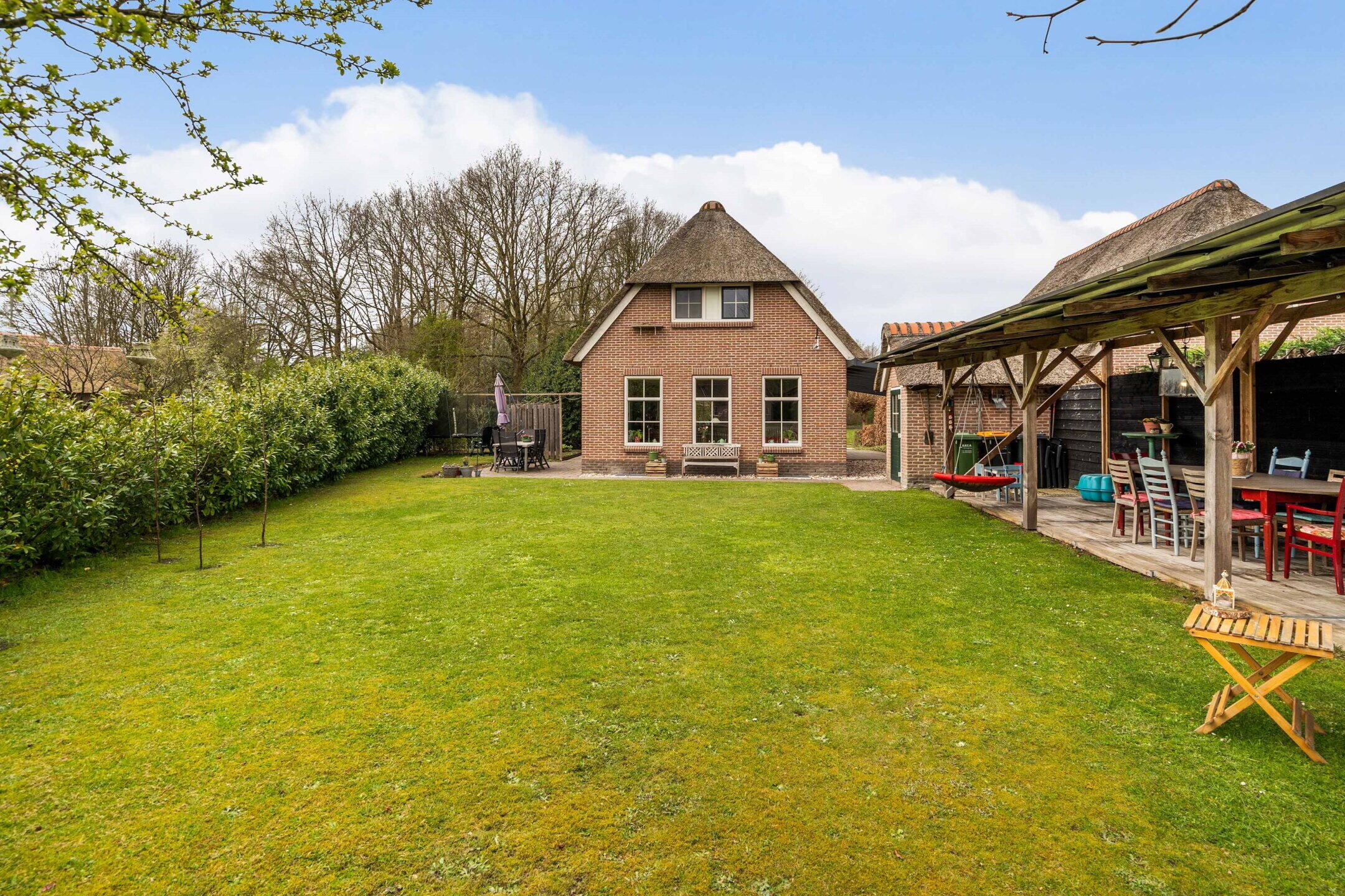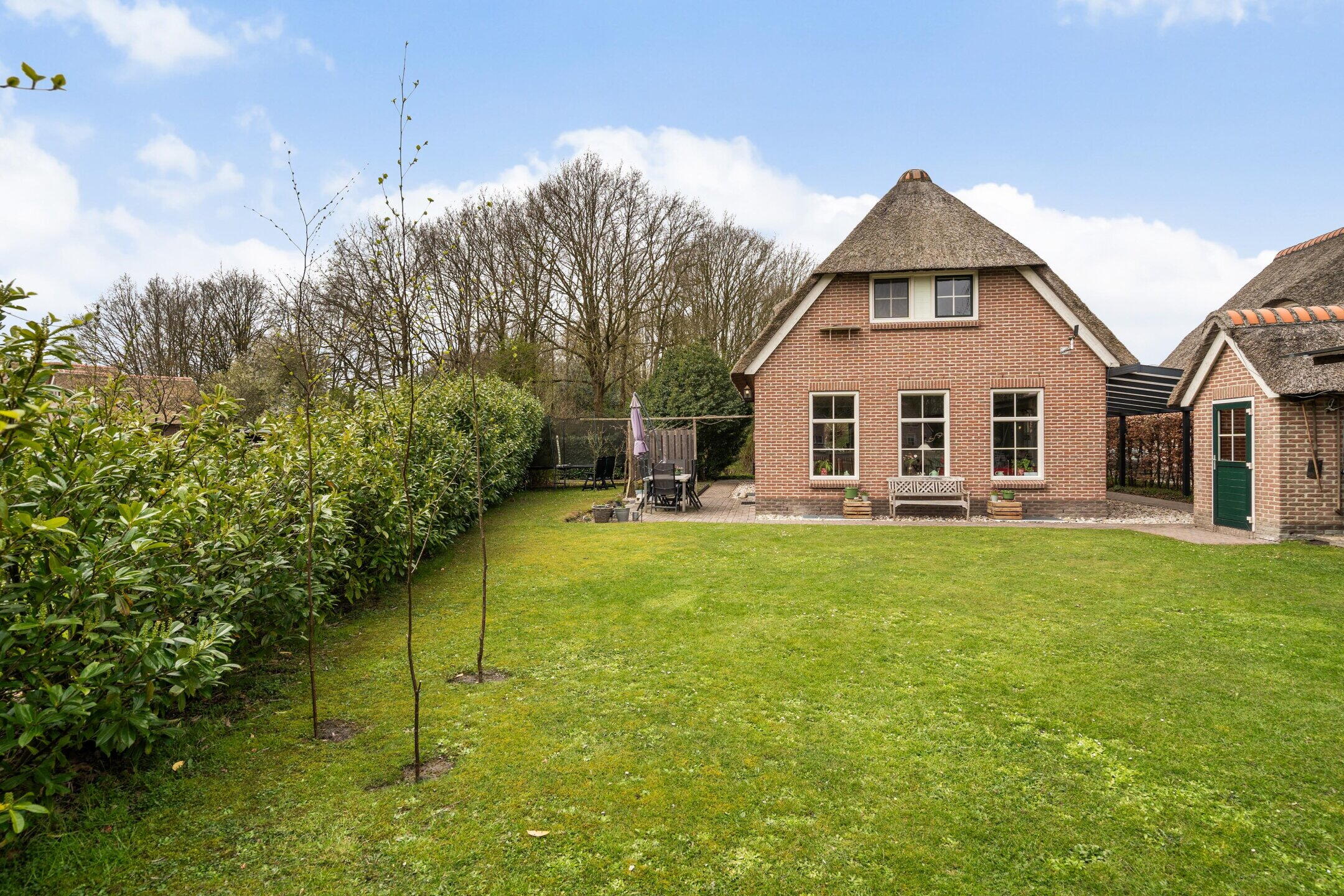 De tuin rondom de woning is verzorgd aangelegd en biedt meerdere zitplekken, zodat u op elk moment van de dag kunt kiezen voor zon of schaduw. De groene setting zorgt voor een ontspannen sfeer en volop privacy.