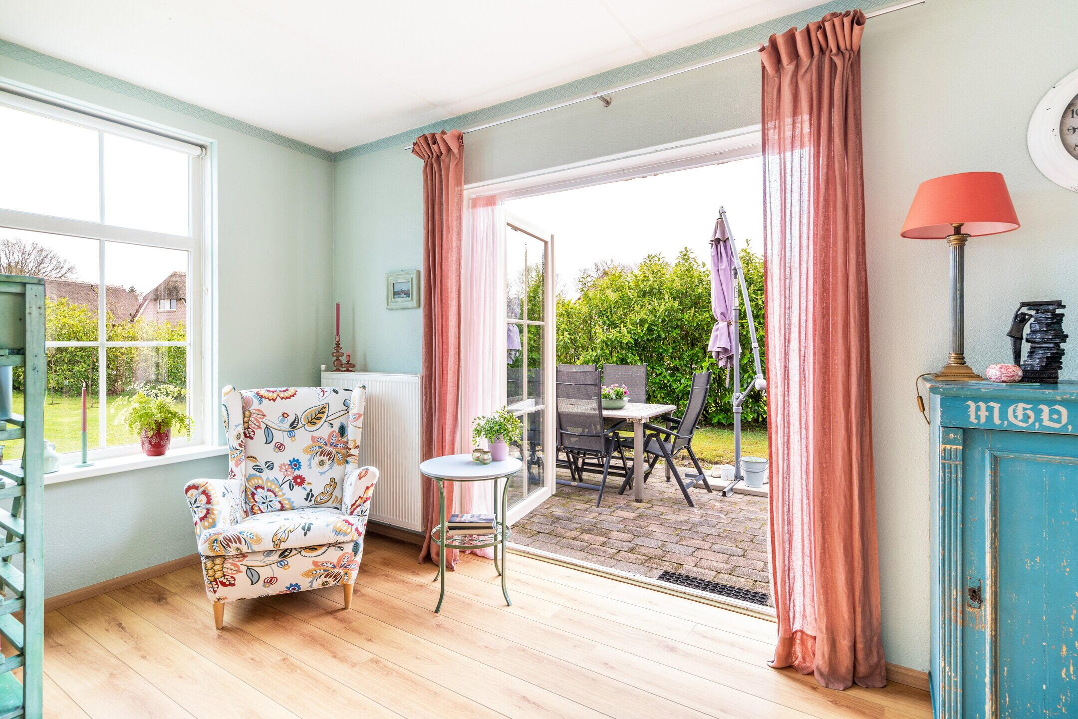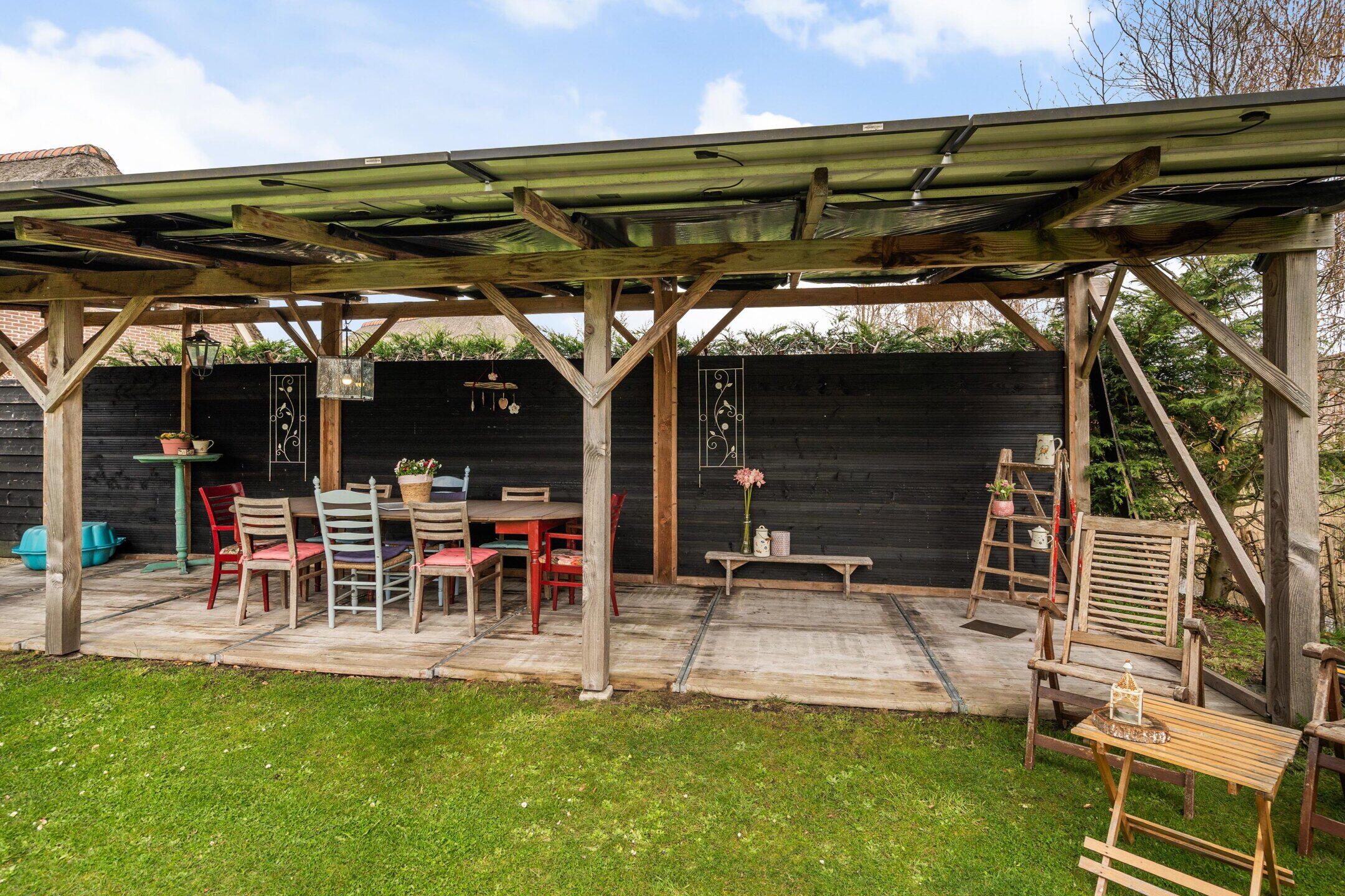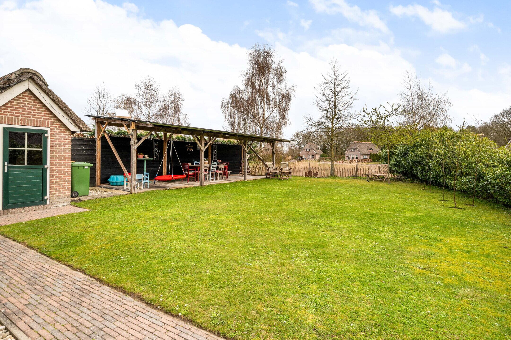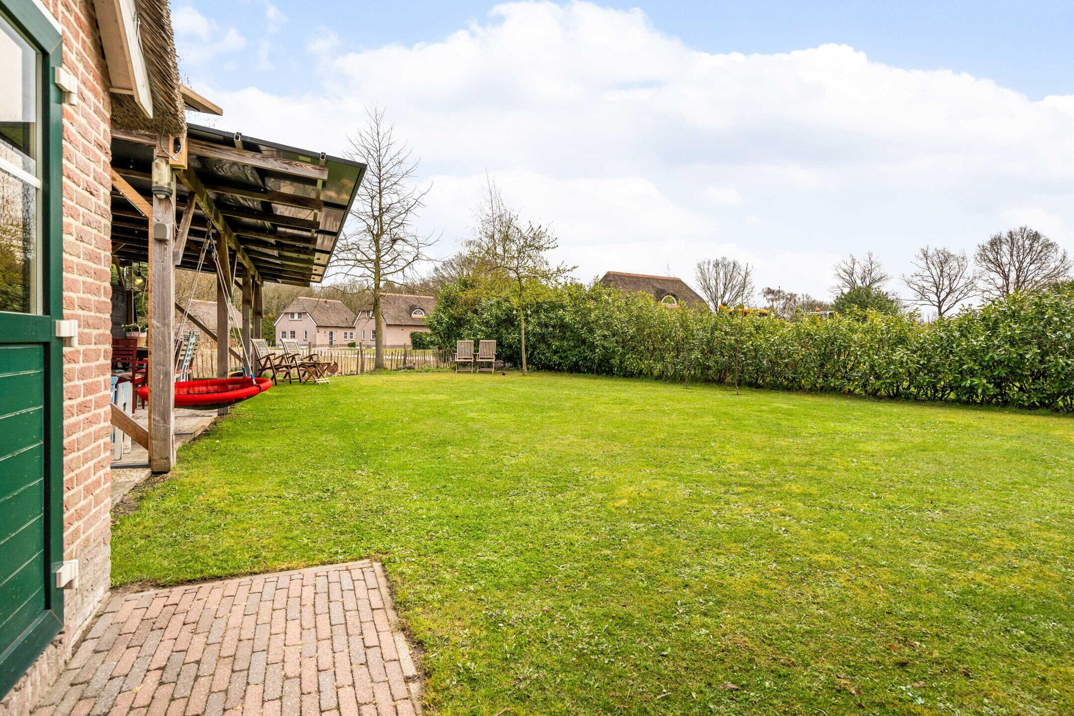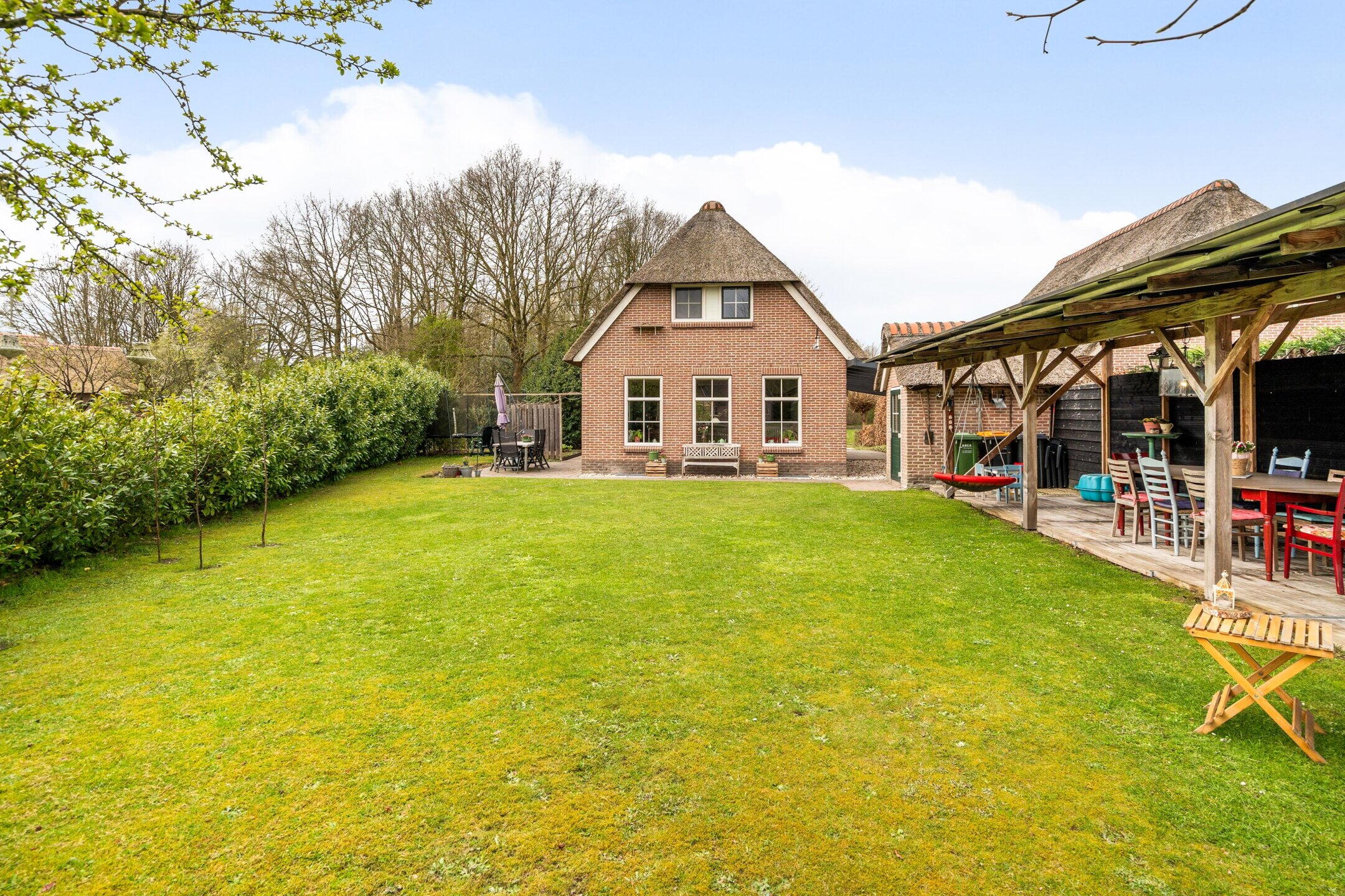De tuin rondom de woning is verzorgd aangelegd en biedt meerdere zitplekken, zodat u op elk moment van de dag kunt kiezen voor zon of schaduw. De groene setting zorgt voor een ontspannen sfeer en volop privacy.